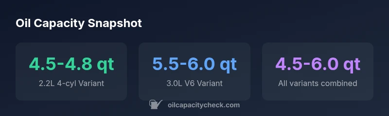 The 1999 Camry offered two main engines: the 2.2L inline-four and the 3.0L V6. Oil capacity ranges reflect these options. The 2.2L engine typically requires about 4.5-4.8 quarts of oil when changing the filter. The 3.0L V6 typically requires about 5.5-6.0 quarts with a filter change. If you replace the oil filter, expect to add roughly 0.2-0.3 quarts more to the total capacity. Always confirm the exact capacity for your car by referencing the VIN and owner's manual, and verify the final level with a fresh dipstick reading after filling. This ensures you avoid overfill, underfill, or oil level fluctuations caused by temperature and engine wear. Additional guidance comes from the Oil Capacity Check team, who compiled these ranges from multiple factory service manuals and veteran maintenance guides.