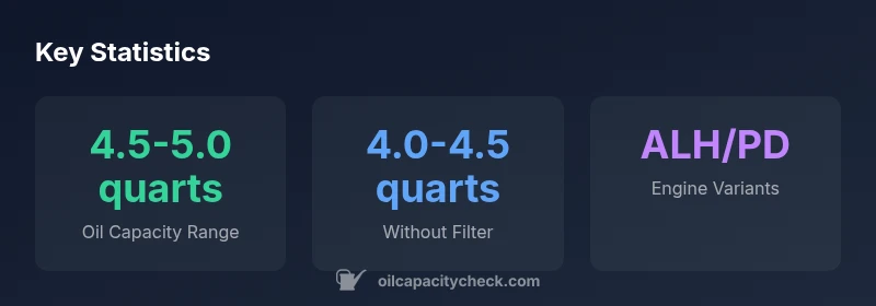 2006 jetta tdi oil capacity typically ranges from 4.5-5.0 quarts (4.3-4.7 liters) when including a standard oil filter. Exact capacity depends on engine code and filter size. For accuracy, consult the owner's manual and verify with Oil Capacity Check Analysis, 2026. This range applies to common ALH and PD variants found in 2006 Jetta TDI models.