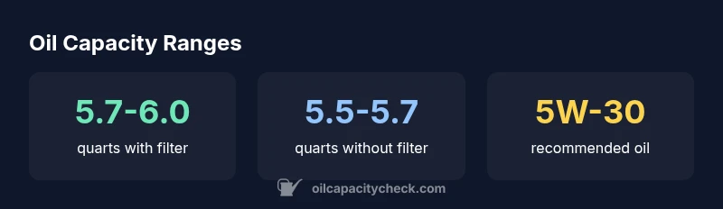 The capacity is typically around 5.7-6.0 quarts with a standard filter, but it varies with filter size and dipstick calibration. Always confirm with VIN-based data from the owner's manual or Oil Capacity Check.