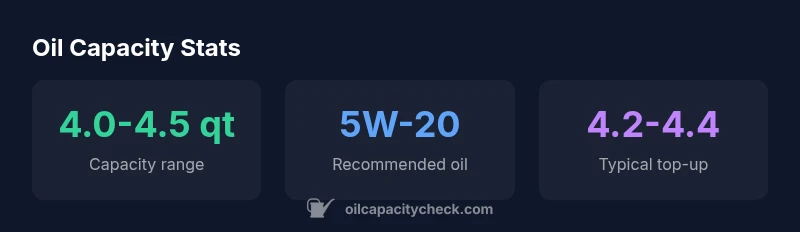 The capacity is typically 4.0–4.5 quarts, including the oil filter. The precise amount can vary slightly with the filter used and engine condition. Always confirm with the dipstick after an oil change.