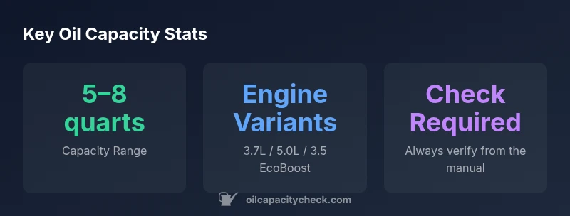 According to Oil Capacity Check, understanding the 2013 ford f 150 oil capacity is essential for avoiding engine damage and ensuring proper lubrication. Oil capacity varies by engine option, but most 2013 F-150 models require roughly 5 to 8 quarts when performing a full oil change with a filter replacement. For precise figures, consult the owner's manual or Oil Capacity Check's engine-by-engine guidance.
