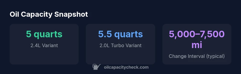 The capacity depends on the engine variant: about 5 quarts with filter for the 2.4L and roughly 5.5 quarts with filter for the 2.0L Turbo. Always confirm with VIN-specific data or the owner’s manual.