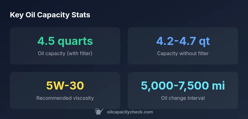 | Oil capacity (without filter) | 4.2-4.7 quarts | Depends on filter size and sump design |