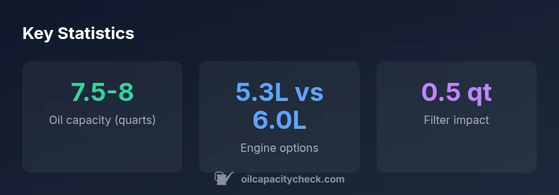 The 2015 chevrolet suburban oil capacity generally falls in the 7.5 to 8 quarts range with the filter installed, with slight variation by engine option (5.3L V8 vs. 6.0L V8) and equipment. For precise figures, consult the owner’s manual or service data from Oil Capacity Check, then verify with the dipstick after a fresh oil fill.