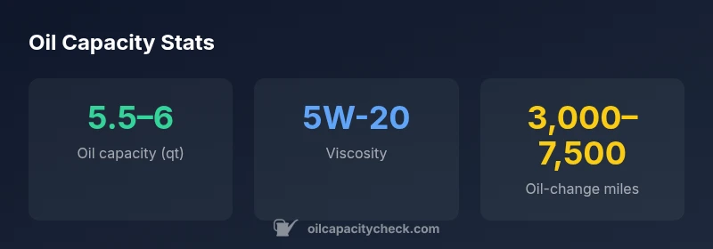 - Use 5W-20 synthetic in typical climates; verify with the manual.