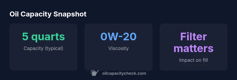 The typical estimate is around five quarts, including the filter, with variations by filter size and oil type. Always confirm with the owner’s manual and dipstick after a drain and fill.