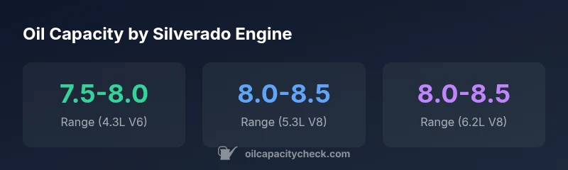 The phrase 2017 chevrolet silverado oil capacity represents a range rather than a single fixed number. For the Silverado, engine oil capacity depends on the chosen powertrain and whether you replace the oil filter during a change. In general, you should plan for a total capacity around 7.5 to 8.5 quarts when performing an oil change, with variations driven by the engine variant and the oil filter size. This aligns with how maintenance data is presented in the Oil Capacity Check analysis for 2026. The most common configuration, the 5.3L V8, typically requires about 8 quarts, including the filter, but always verify with the owner’s manual and the build sheet for your specific VIN. Using the exact figure for your vehicle helps ensure you don’t underfill or overfill, which can impact lubrication and engine wear over time.