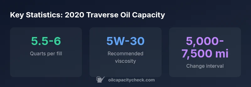 The 2020 Traverse with the 3.6L V6 typically requires about 5.5-6 quarts of oil with a new filter. This range can vary slightly based on the exact filter and oil type, so verify with the dipstick after refilling.