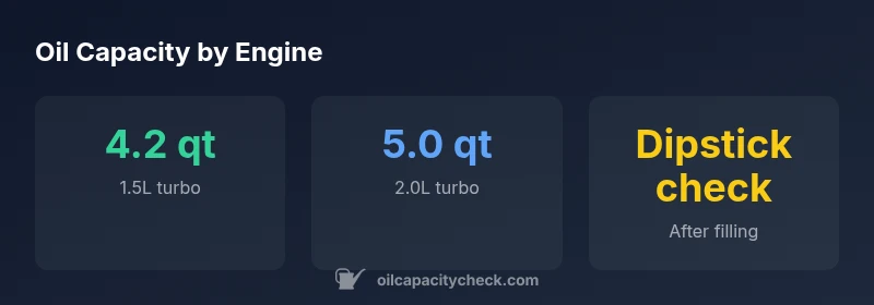 - Engine variant dictates capacity: 4.2 qts for 1.5L, 5.0 qts for 2.0L.