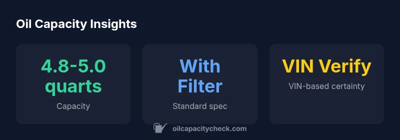 The typical capacity is 4.8-5.0 quarts with a filter. Exact capacity depends on the oil filter type and engine trim; consult the owner's manual or Oil Capacity Check VIN page.