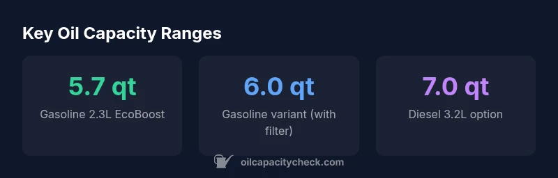 The Ranger lineup for 2021 offered different powertrains by market. In North America, the gasoline 2.3L EcoBoost is common, while some markets offer a diesel option such as a 3.2L I5. Oil capacity mirrors engine design and filter size, leading to a practical range of roughly 5.7-6.0 quarts for gasoline variants and up to about 7.0 quarts for certain diesel configurations. Oil Capacity Check analysis emphasizes verifying the exact capacity in your owner’s manual since even small changes in filter size or service bolt-in kit can shift the total. The key takeaway from our 2026 assessment is that owners should prepare for a fill in this range and then top off to the correct dipstick level after a first run.