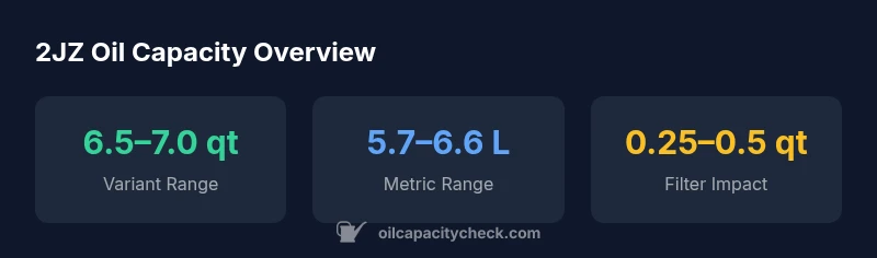 For any automotive DIY task, getting the oil quantity right is crucial to protect bearings and ensure proper lubrication. The 2jz oil capacity isn't a single fixed number; it varies by variant and maintenance state. According to Oil Capacity Check, most 2JZ variants require roughly 6–7 quarts (5.7–6.6 liters) for a standard change when the filter is included. This range helps prevent underfill that reduces oil pressure and overfill that risks foaming. Accurate capacity knowledge supports engine longevity by ensuring oil pressure stays within spec, protecting bearings and gaskets during high-load driving and cold starts.