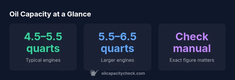 | V6 engines | 5.5–6.5 quarts | Higher capacity due to larger sump |