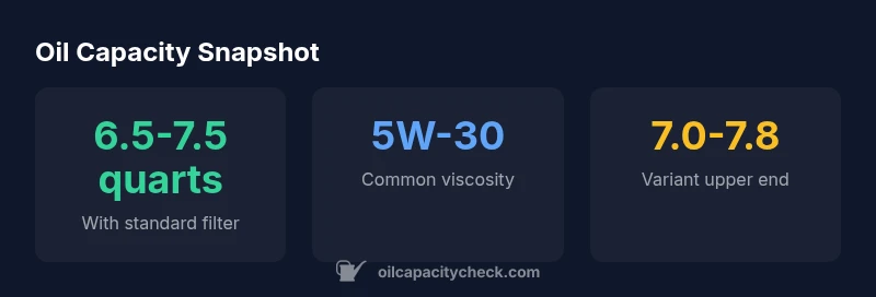 | 6.2L V8 performance variants | 7.0-7.8 quarts | Slightly higher capacity |