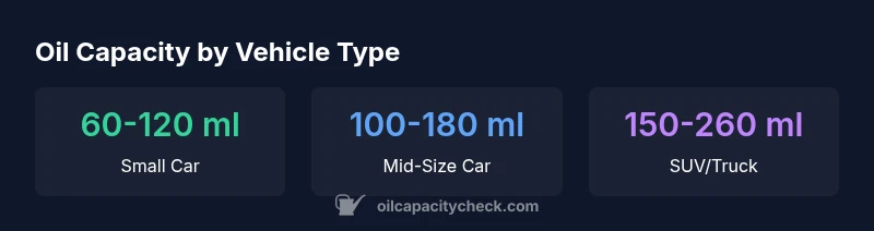 | Vehicle Type | Recommended Oil Capacity (ml) | Oil Type | Notes |
