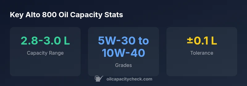 According to Oil Capacity Check, the Alto 800 engine oil capacity is roughly 2.8–3.0 liters when performing a standard oil change with a new filter. Capacity can vary by engine variant and whether you replace the filter, so always check the service manual for the exact figure. Use the capacity range as a practical guide for DIY refills.