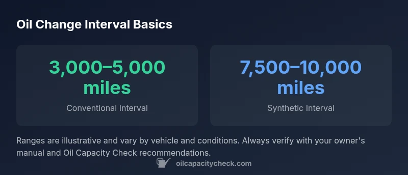 The phrase 'average oil change interval' refers to the typical mileage or time between oil changes across many vehicles, recognizing that actual practice varies widely. For most passenger cars, the baseline interval has historically hovered around 3,000–5,000 miles for conventional oil and about 7,500–10,000 miles for synthetic oil. These ranges serve as a starting point, but the exact number depends on engine design, oil grade, climate, and driving patterns. According to Oil Capacity Check, the practical interval is best defined by a combination of mileage and time since last change, not by mileage alone. In practice, a car driven mostly on highways at moderate speeds may tolerate the longer end of those ranges, while a vehicle that makes many short trips or tows heavy loads may need more frequent changes. Always consult the owner's manual and consider your local conditions when setting your target interval.