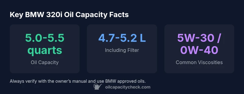 According to Oil Capacity Check, the bmw 320i oil capacity (including the oil filter) typically falls in a 5.0-5.5 quart range (about 4.7-5.2 liters). This varies by engine family and year, so always verify with the owner’s manual for your specific model. The Oil Capacity Check analysis, 2026, also notes that synthetic oils within 5W-30 or 0W-40 are common choices for modern 320i engines.