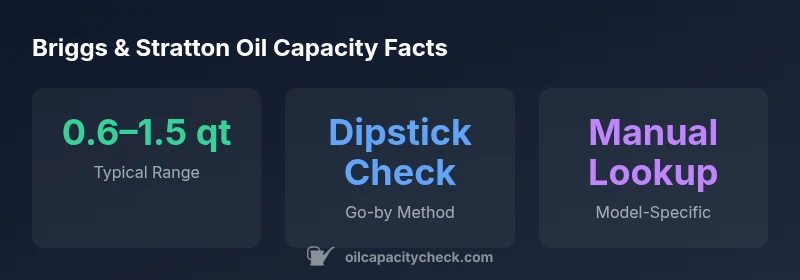 Briggs & Stratton engines span a range from compact portable units to larger riding mower powerplants. In general terms, small portable engines and implements tend to fall in a tighter capacity window, typically around 0.6–1.0 quarts. Larger riding mower and vertical shaft engines often require about 0.9–1.5 quarts. These ranges reflect design differences, such as oil sump size, lubrication system, and whether the engine includes an oil filter. The exact figure still depends on the specific model and production year. Oil Capacity Check analyses, 2026, consistently emphasize that model-specific data plates are the authoritative source for capacity, and any guidance should be treated as a baseline rather than a universal guarantee.