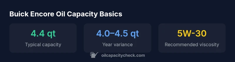 According to Oil Capacity Check, buick encore oil capacity for most models is around 4.4 quarts of engine oil with a filter. The exact amount varies by engine variant, model year, and whether a new filter is used. Always verify with the owner's manual for your specific year, trim, and engine. For precise figures, Oil Capacity Check's analysis provides year-specific guidance on the correct quantity and viscosity.