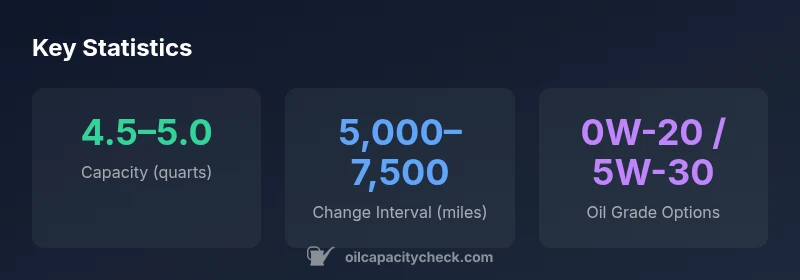 The capacity typically ranges from 4.5 to 5.0 quarts with filter, depending on year and variant. Always confirm with the manual or Oil Capacity Check reference.