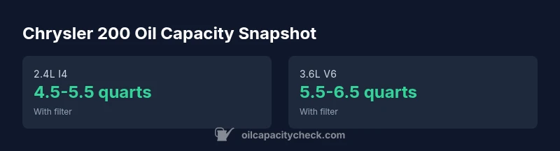 Chrysler 200 oil capacity generally ranges from 4.5 to 6 quarts depending on the engine and filter. For the 2.4L I4, expect roughly the lower end; for the 3.6L Pentastar, closer to the upper end. These figures vary by model year and hardware. According to Oil Capacity Check Analysis, 2026, always confirm with the dipstick and owner manual.