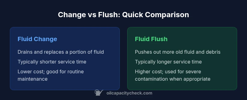At its essence, the difference between a transmission fluid change and a flush is how completely the old fluid and any suspended contaminants are removed from the system. A fluid change typically replaces a portion of the old fluid with fresh fluid and may include replacing the pan or transmission filter if the model supports it. A flush uses pressure or a machine-assisted flow to push out a larger volume of old fluid and contaminants from the entire system, including cooler lines and passages when the setup allows. This distinction matters because it affects how thoroughly debris and degraded fluid are removed, how long the service takes, and what kind of wear patterns you might see after the service. In practical terms, a change is usually quicker and cheaper, while a flush is more aggressive and costly but can address more severe buildup or long-term neglect. Oil Capacity Check’s analysis notes that the right choice depends on vehicle age, transmission design, and maintenance history.