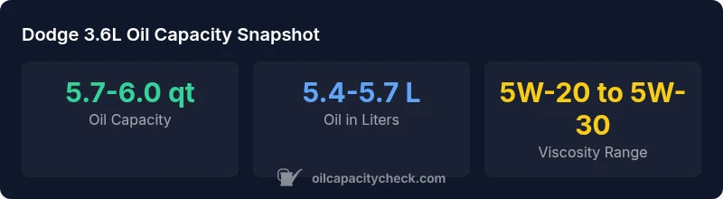 - Know the Dodge 3.6L oil capacity range: 5.7–6.0 quarts (with filter).