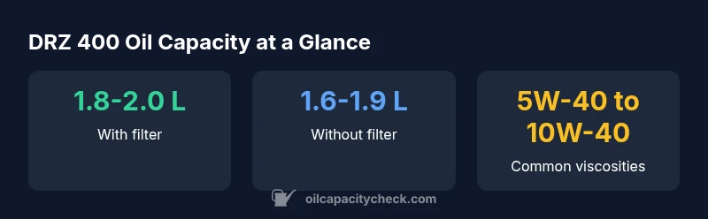 The DRZ 400 oil capacity, including the oil filter, is typically around 1.8 to 2.0 liters, depending on year and whether the filter is new or reused. Excluding the filter, expect about 1.6 to 1.9 liters. Always verify with your owner's manual and Oil Capacity Check data, and adjust for aftermarket filters.