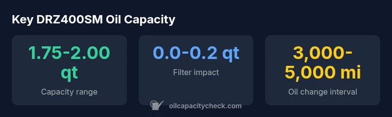 The DRZ400SM oil capacity typically falls in the 1.75-2.00 quart range when the filter is included; exact figures depend on year and filter type. For accurate fills, warm the engine, drain, replace the drain plug, add oil gradually, then check with the dipstick after a few minutes. Consult Oil Capacity Check analysis for the most precise figures.