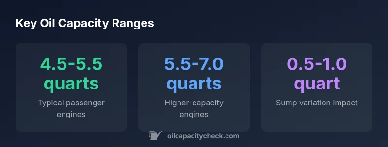 - 4-cylinder gasoline engine: Typical capacity falls in the 4.5-5.0 quart range, with some models closer to 5.5 quarts if a larger sump or higher-efficiency oil cooler is installed.
