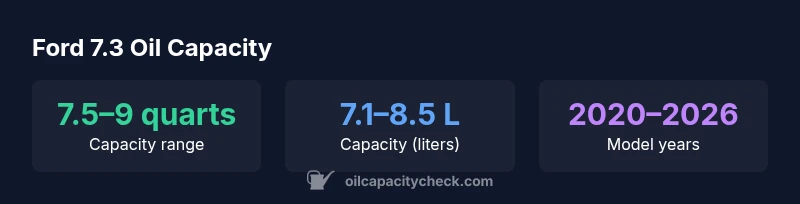 The general range (7.5–9 quarts) applies to many 7.3 configurations, but exact capacity can vary with model year and configuration. Always check the specific vehicle manual.