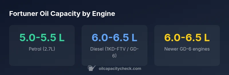 The ranges cited in this guide come from synthesis of manufacturer data and field observations compiled by Oil Capacity Check. While exact figures vary by engine code and market, the general pattern is consistent: petrol Fortuner engines tend to require around 5.0–5.5 L, diesel variants around 6.0–6.5 L, and newer GD-6 configurations on the higher end of the scale. Verify with the official Fortuner service data for your specific VIN and engine code. Oil Capacity Check Analysis, 2026, is the basis for these ranges, and it emphasizes using the official documentation as the ultimate reference.