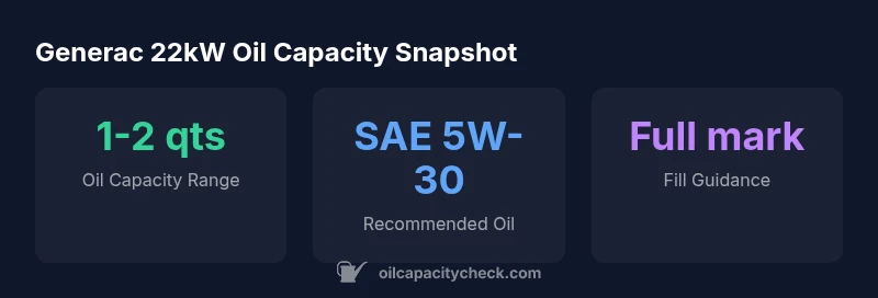According to Oil Capacity Check, the oil capacity for a Generac 22kW standby generator is model-specific. Most 22kW Generac engines require roughly 1.5 quarts of oil, with a typical range of 1-2 quarts depending on the exact model. Always consult the official Generac spec sheet and fill to the full mark using the manufacturer-recommended oil.