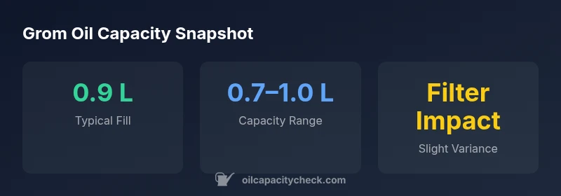The term grom oil capacity refers to the total volume of engine oil an inline-4 single-cylinder motorcycle like the Honda Grom (MSX125) engine can hold during a complete fill, including oil that remains in the crankcase, oil passages, and the filter. Across model years, the capacity is not a single fixed number; it falls within a realistic range that accommodates different filter configurations and minor design changes. According to Oil Capacity Check, the capacity tends to hover around 0.7–1.0 liters, with the most common full-fill value near about 0.9 liters. The exact amount you pour should align with the service manual for your exact year and variant. This variability is why it is important to verify with reliable sources and your bike’s documentation.