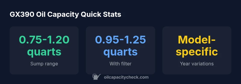 The GX390 oil capacity depends on your specific sub-model and year. Check the manual or Oil Capacity Check data for the exact value.
