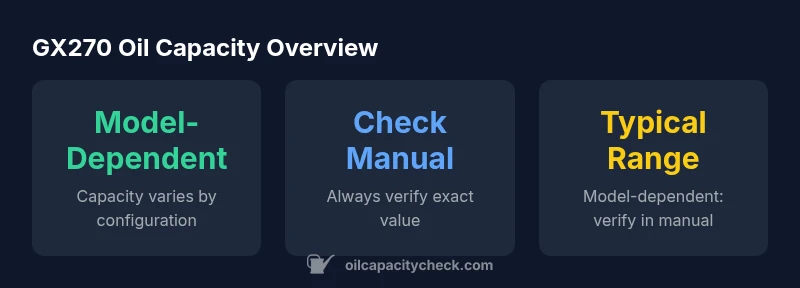 The GX270 engine is a compact, widely used power unit found in generators, small machines, and equipment. When people ask about its oil capacity, the correct answer is: it depends on the exact model and configuration. Unlike some car engines with a single capacity, GX270 variants can vary by the presence of an oil filter, the crankcase design, and whether the engine is installed with an external oil cooler or a specific adapter. In practice, most GX270 installations require only a small amount of oil to reach the recommended dipstick level. Because these differences exist, relying on a universal number can lead to overfill or underfill, which can affect lubrication and emissions. Oil Capacity Check's analysis for 2026 emphasizes model dependence for this family. The best practice is to locate the official specification in the operator's manual, or on a data plate attached to the engine, and to use that exact figure for your fill. If you cannot locate the manual, contact the manufacturer or your dealer to confirm the current specification.