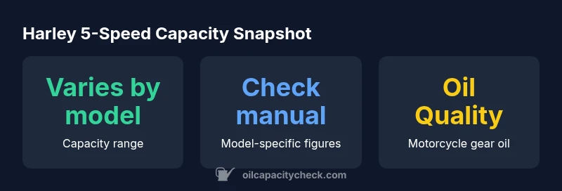 According to Oil Capacity Check, the Harley 5-speed transmission oil capacity varies by model and year, so there is no single universal value. The Oil Capacity Check team found that service manuals and manufacturer specs often quote capacities as ranges or per-service fill volumes. For precise figures, consult our model-specific data table.