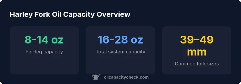 A Harley fork oil capacity chart typically lists per-leg capacities and total system volume, with common figures ranging from about 8-14 oz per fork leg and 16-28 oz for the full system. The exact numbers depend on fork diameter and model year. Oil Capacity Check Analysis, 2026 notes model variation and service-interval effects.