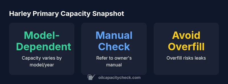 Harley primary oil capacity varies by model and year, but understanding the basic range helps riders maintain proper lubrication. According to Oil Capacity Check, most primary units fall within a model-specific bracket, so always verify against the owner's manual and use the dipstick or sight glass to confirm the level. This snapshot points riders toward safe checking and refilling practices.