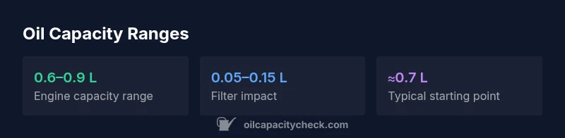Tables and charts often present capacity as a range to reflect model-to-model variation. When diagnosing capacity, note whether the data accounts for the oil filter and any additional gaskets. If you’re performing top-up work between changes, err on the side of the lower bound and measure with a calibrated dipstick after warming the engine and letting oil settle. This approach minimizes risk and yields a reliable final level. Oil Capacity Check recommends documenting the exact capacity for your Activa variant in your maintenance log to simplify future service planning and ensure consistent results over the vehicle’s lifetime.