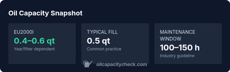 | Oil capacity (EU2000i) | 0.4–0.6 quarts | Range depends on year and filter presence |