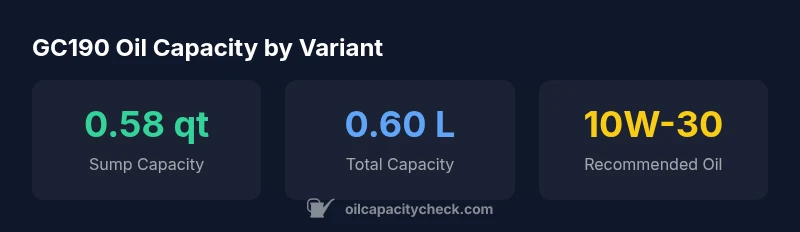 The GC190 sump capacity is typically about 0.58-0.63 quarts (roughly 0.55-0.60 liters). Always verify the exact figure in your owner's manual for your specific model year and version.