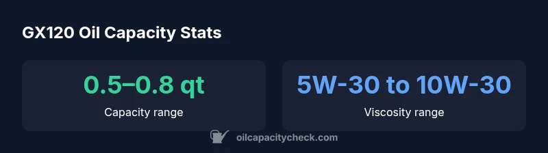 The GX120 typically requires about 0.5–0.8 quarts of oil, depending on variant and fill method. Always verify with the dipstick and refer to the manual for model-specific guidance.