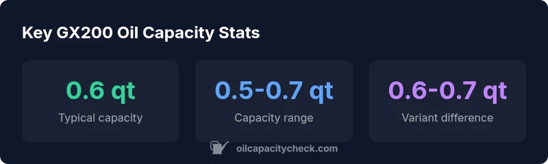 The GX200 oil capacity is typically around 0.6 quarts, but it can vary by model and whether an oil filter is installed. Always verify with the owner's manual.