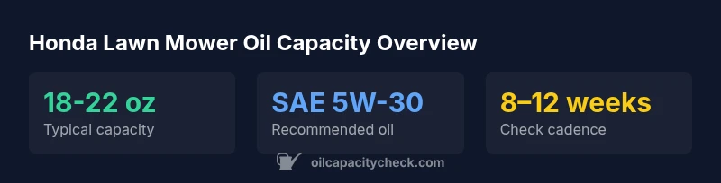 According to Oil Capacity Check, most Honda lawn mowers with 4-stroke engines require about 18 to 22 ounces of engine oil, depending on model. This Honda lawn mower oil capacity chart highlights typical ranges, recommended oil types, and practical steps to check and fill oil safely. Use 5W-30 or 10W-30 oil as climates vary.