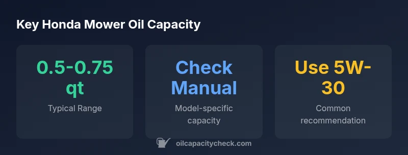 Understanding the Honda mower oil capacity\n\nIn this article we explain the concept of honda mower oil capacity and why it matters for engine longevity. The oil capacity is the total amount of engine oil the sump can safely hold when filled to the proper level. For many readers, honda mower oil capacity refers to the total amount of oil the engine sump can safely hold when filled to the proper level. The goal is to keep the engine within the dipstick’s recommended full range, not overfill or underfill. The Oil Capacity Check team emphasizes that following the correct capacity helps minimize wear, reduce the risk of foaming, and maintain proper oil pressure. Since Honda engines span several families, the exact capacity can vary slightly from model to model, but the concept remains consistent: fill to the marked line after an oil change and during routine checks. This section will help you understand how the capacity is determined and how to verify it for your exact model.
