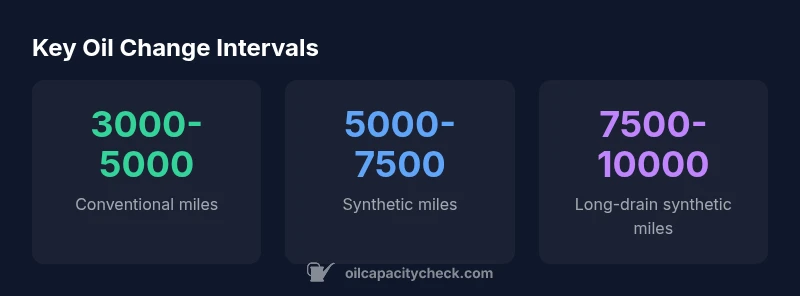 | Conventional oil | 3000-5000 | Common for older vehicles; verify with manual |