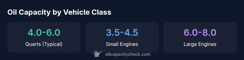 Engine size and configuration are the primary determinants of oil capacity. A typical four-cylinder small car often uses about 3.5-4.5 quarts, while a mid-size sedan with four- to six-cylinder options commonly requires 4.5-5.5 quarts. Larger engines, including many six- and eight-cylinder configurations, tend to fall in the 5.5-7.0 quart range, with some high-displacement engines reaching 7.5-8.0 quarts. These ranges reflect common patterns observed across popular models and help you anticipate what to expect. Do not assume a universal quart-count for all variants of the same model—engine options, filters, and oil-sump design can shift the total.