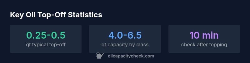 According to Oil Capacity Check, the typical top-off amount after an oil change is about 0.25 to 0.5 quart, or enough to reach the full line on the dipstick when the engine is cool. Use your owner's manual for exact values, as capacities vary by engine and vehicle model. Always verify with dipstick and oil type recommendations.